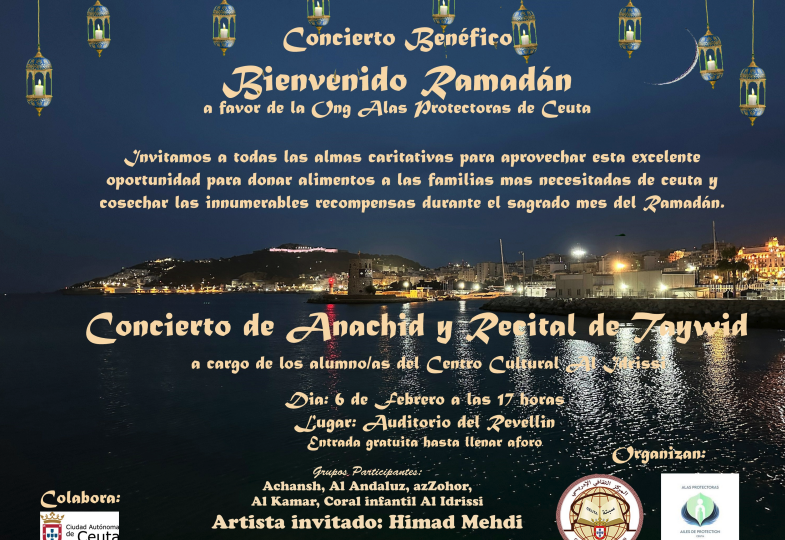 Ya está cerca el Ramadán 2026 y comienzan a conocerse los actos preparados en Ceuta para su celebración. El primero lo ha dado a conocer este viernes la Ciudad, anunciando un concierto en el Teatro del Revellín organizado por Al Idrissi a beneficio de la oenegé Alas Protectoras. Este concierto de Ramadán de Anachid y